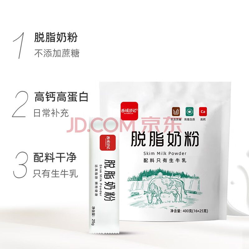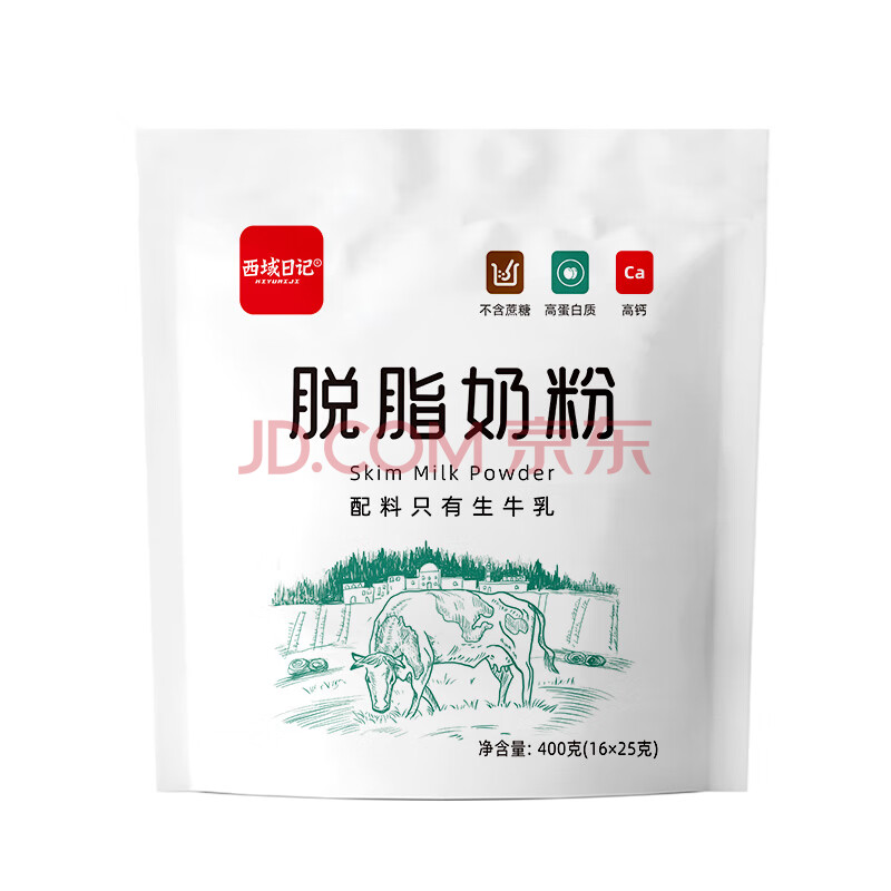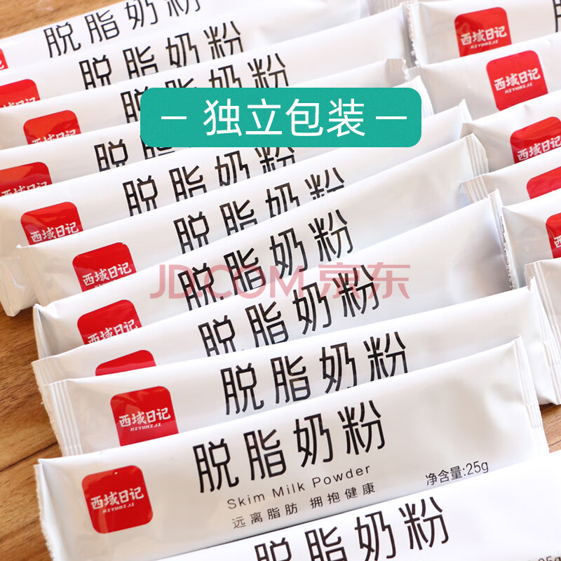 商品相册:西域日记脱脂奶粉独立小包装成人奶粉低脂高钙400g高蛋白纯牛奶粉女士男士第