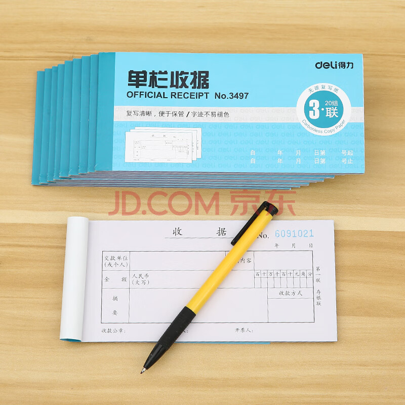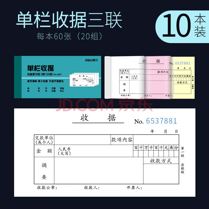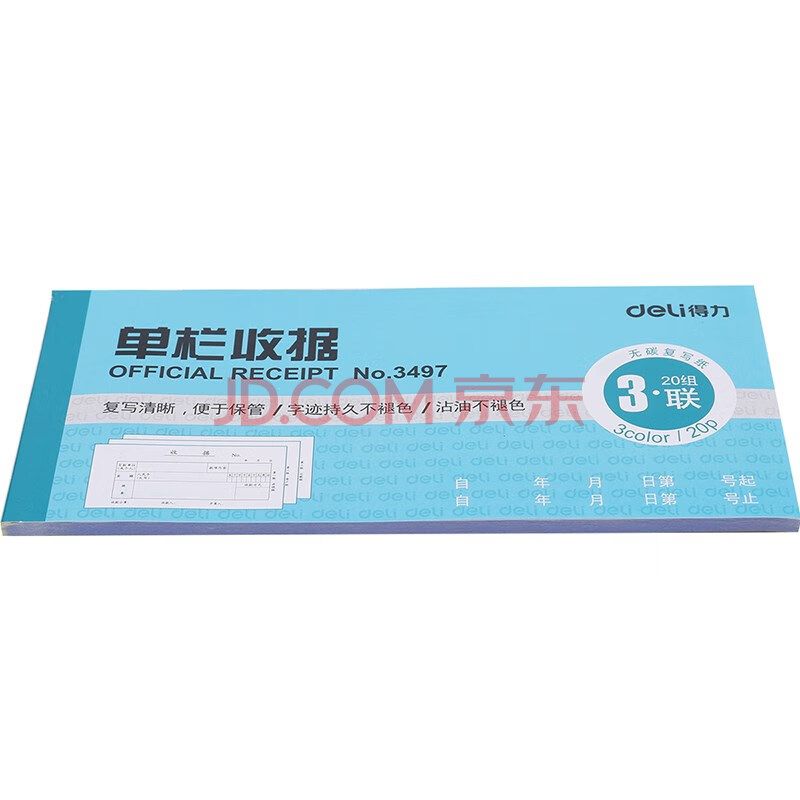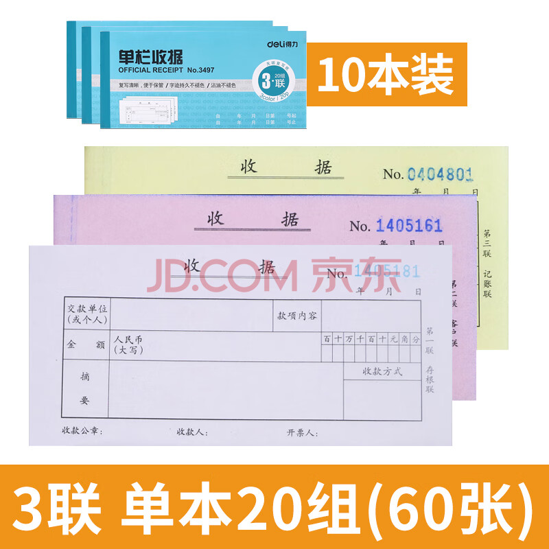 商品相册:得力(deli) 无碳原纸 三联单栏收据 颜色随机10本装 财会用品 办公用品 三联单栏收据第1张/共9