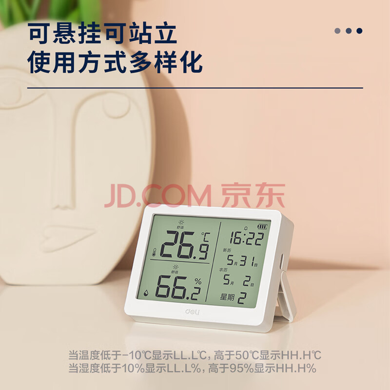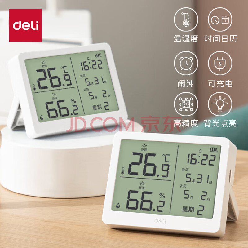 商品相册:得力(deli)室内温湿度表 LCD\电子温湿度计老人儿童礼物生日礼品带闹钟婴儿房办公用品可充电白色LE504-WH第