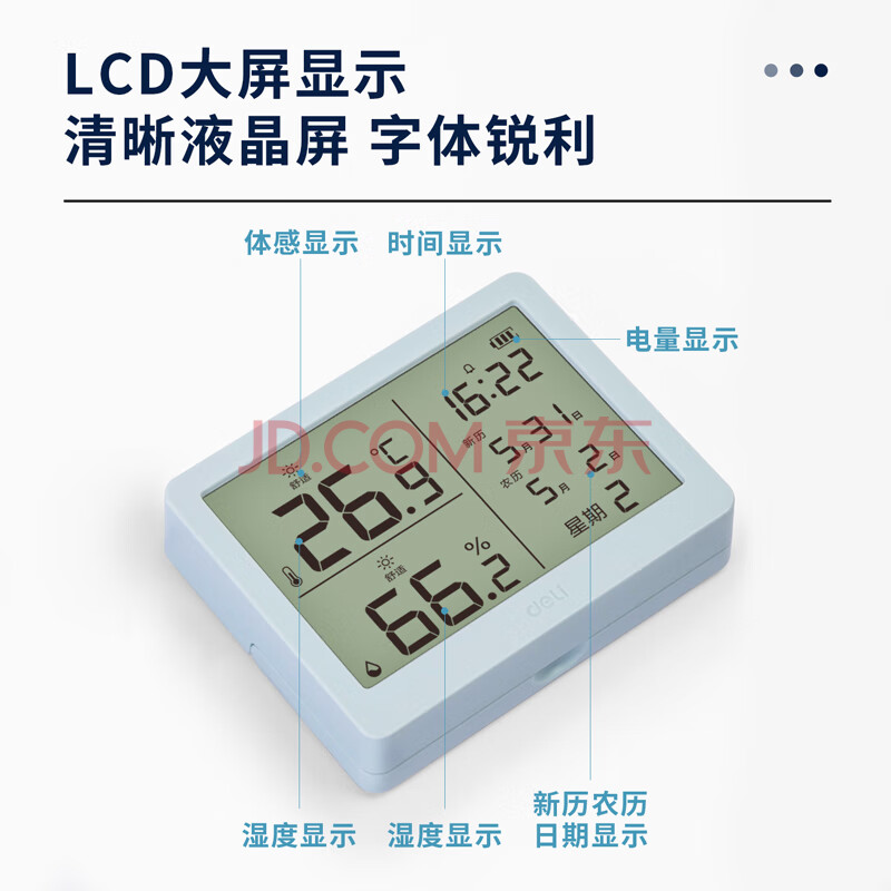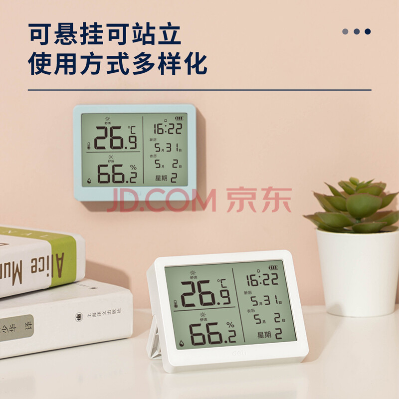 商品相册:得力(deli)室内温湿度表 LCD\电子温湿度计老人儿童礼物生日礼品带闹钟功能 婴儿房办公用品 白色LE502-WH第