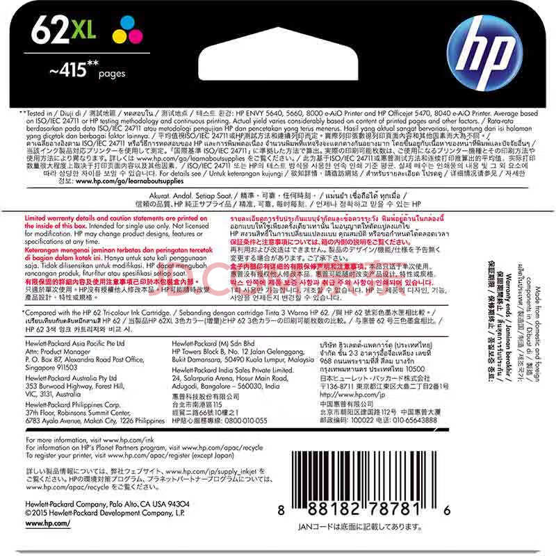 商品相册:惠普(HP)C2P07AA 62XL 高容量原装彩色墨盒 适用于HP OfficeJet 200 移动打印机第