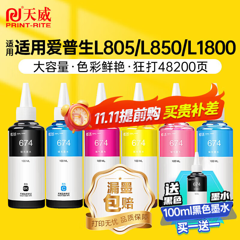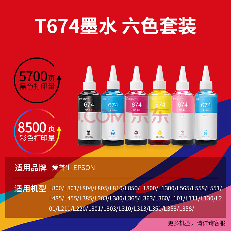 商品相册:天威 674墨水100ml 六色套装 适用爱普生L805 L850 L1800 L810 L801 L360 L101 L301打印机 T6741-T6746第