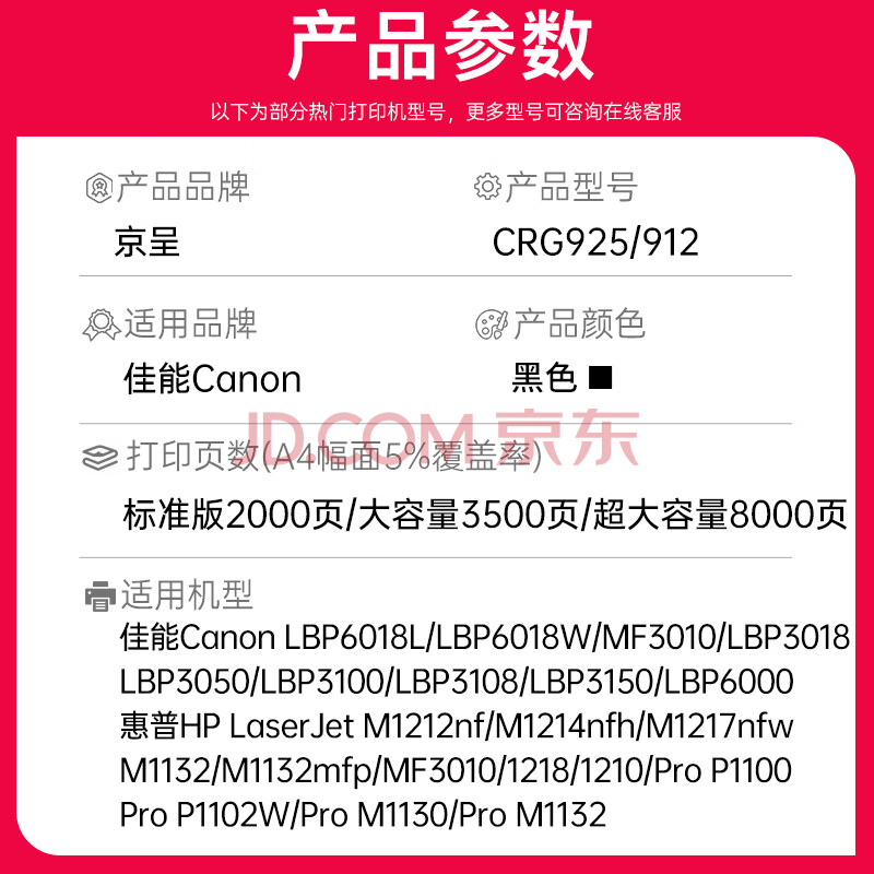 商品相册:京呈适用佳能canon MF3010 LBP6018L/W LBP3018 6000 3108 3100 P1102W打印机墨粉盒墨盒 CRG-925/912标准硒鼓第