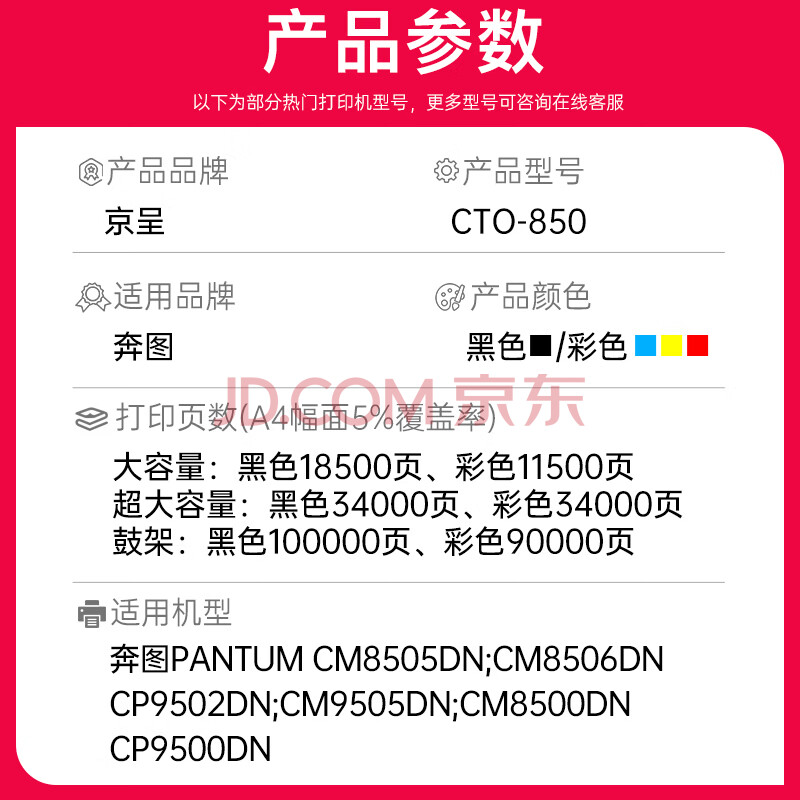 商品相册:京呈CTO-850粉盒适用奔图CM8505DN墨粉CP9502DN墨盒CM8506dn/9505DN硒鼓打印机办公耗材9500 CTO-850XC四色套装第