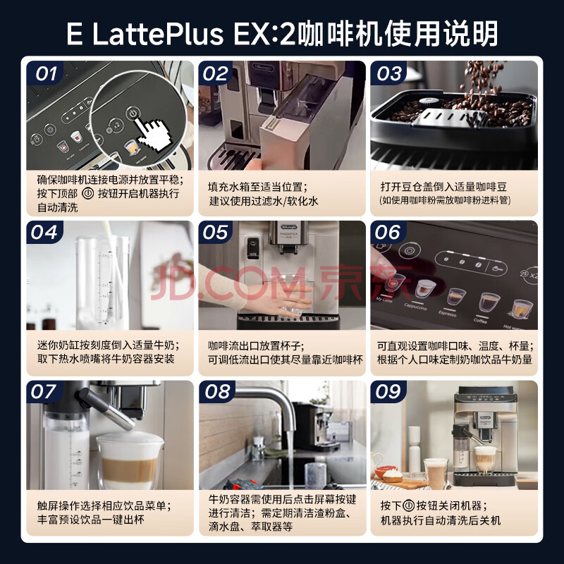 商品相册:德龙(Delonghi)咖啡机 家用全自动咖啡机进口 意式现磨自动奶泡卡布奇诺迷你奶缸全彩触屏 E LattePlus EX:2 礼物第