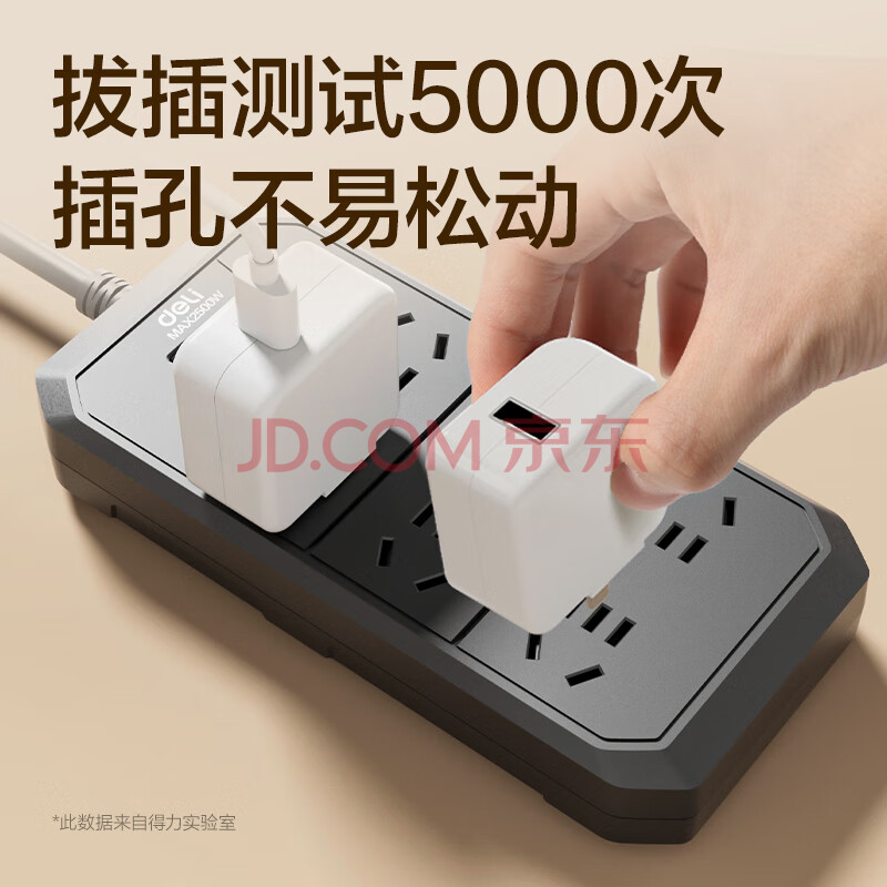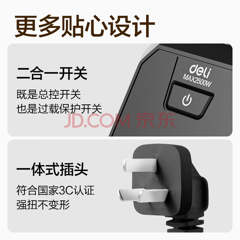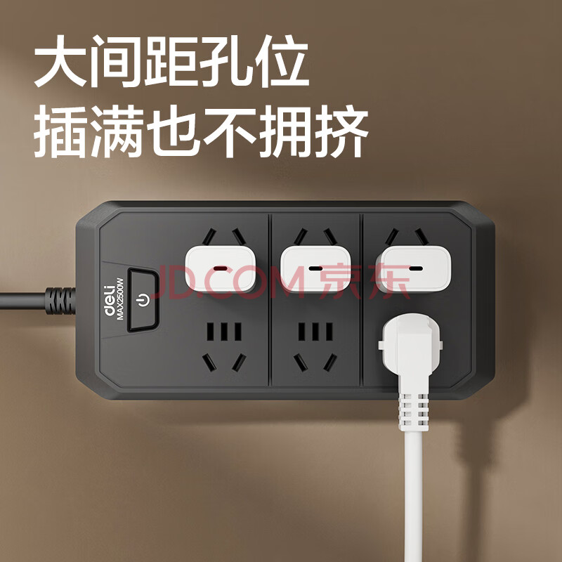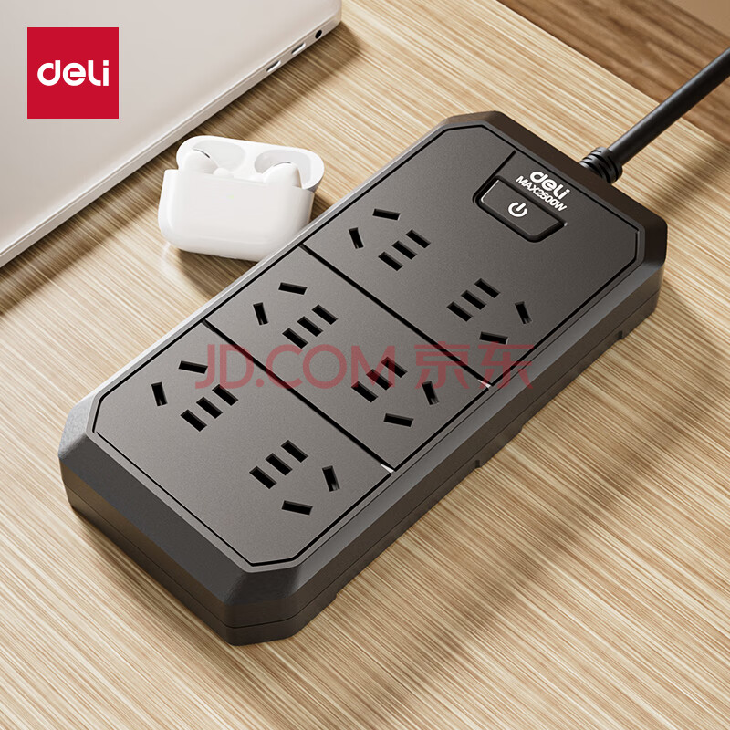 商品相册:得力(deli)3C认证国标安全插座/插排/插线板/接线板/排插/拖线板 6位2米 总控开关 黑色 18335(02)第