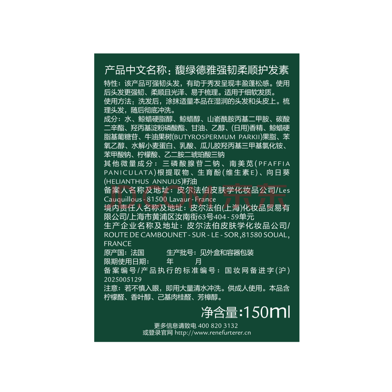 商品相册:馥绿德雅(RENE FURTERER)小白珠强韧柔顺护发素150ml 修护发质损伤 防断发 柔顺滋养润发乳第
