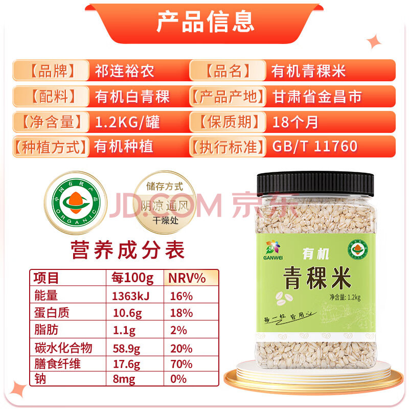 商品相册:祁连裕农有机青稞米 高原谷物 白青稞 五谷杂粮 粗粮 粥米伴侣2.4斤罐装第