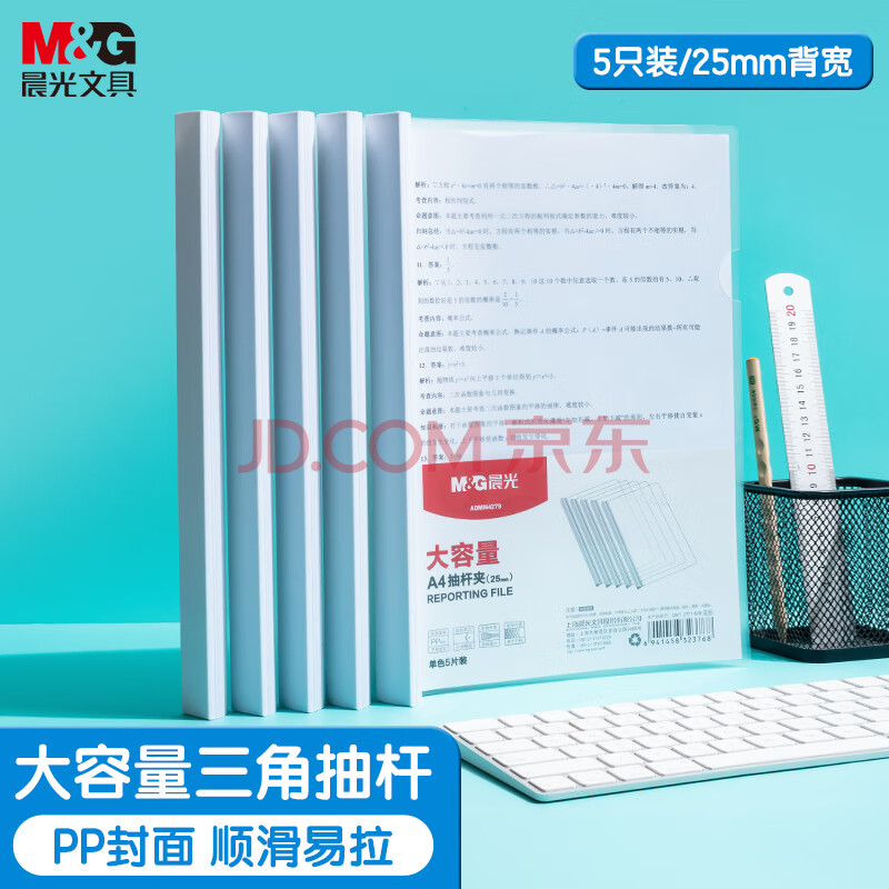 商品相册:晨光(M&G)文具 5个装A4/25mm透明抽杆夹 大容量办公报告收纳拉杆夹 资料整理收纳文件夹ADMN4279I第