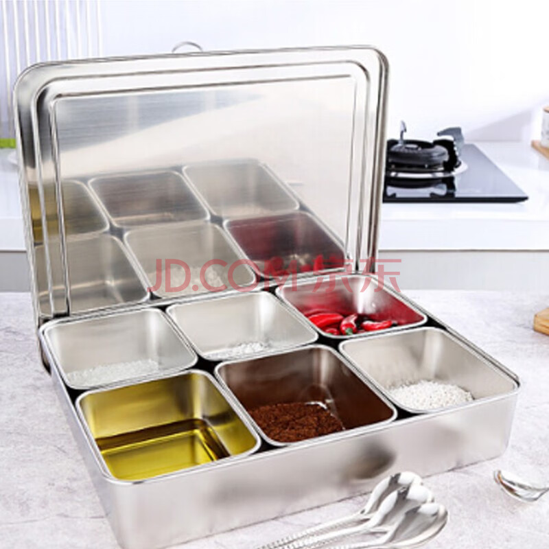 商品相册:BEIXUN 304不锈钢调味盒带盖 方形料盒盐罐八格六格套装 不锈钢味盅调料盒 方形8格第