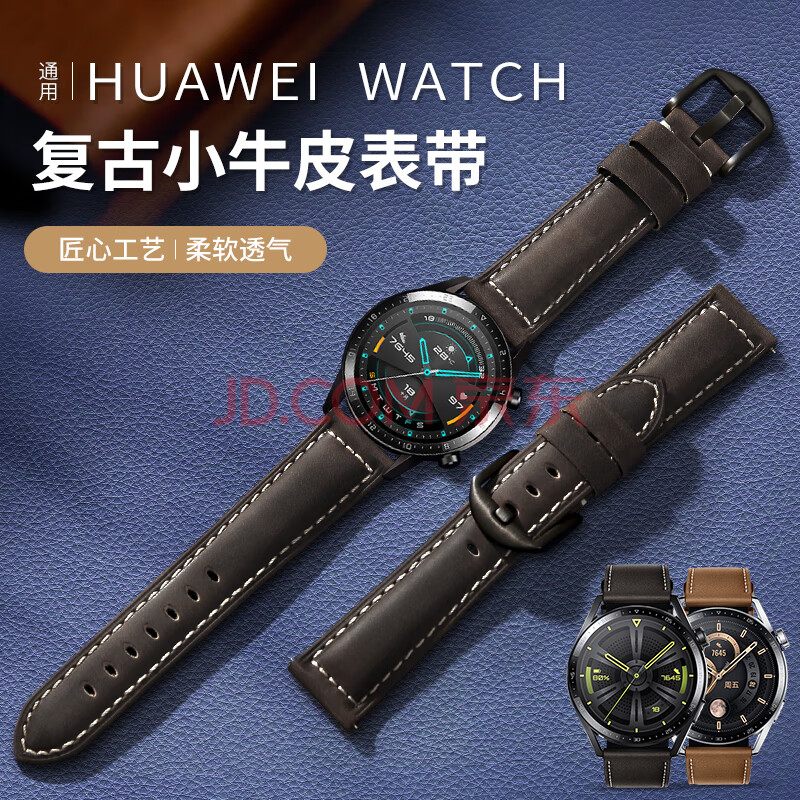 商品相册:码仕 适用华为手表表带秋冬Watch5/4/3/GT6/5/gt4/3/2/Pro/荣耀Magic2磨砂牛皮带黑色黑扣22mm第