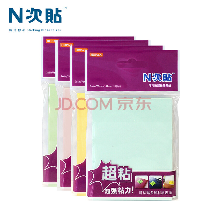 商品相册:N次贴(STICKN)4本装超粘便利贴报事贴/便条纸/便签纸/便签本76*101mm360张 柔和四色31099-J4第