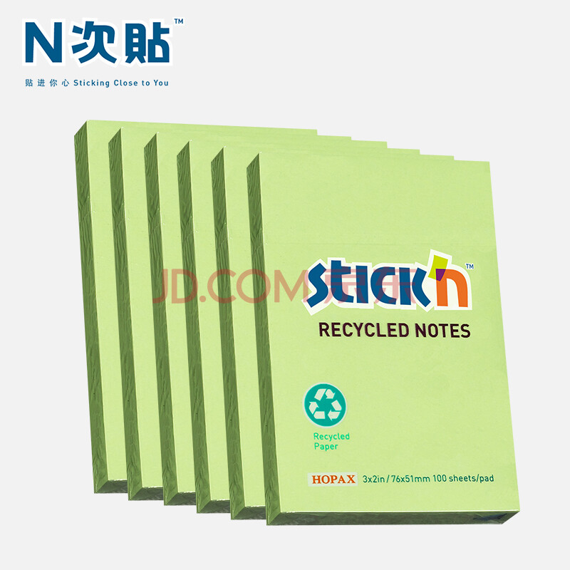 商品相册:N次贴(STICKN)6本装环保再生纸便利贴报事贴/便条纸/便签纸/便签本76*51mm600张 绿色36504-J6第