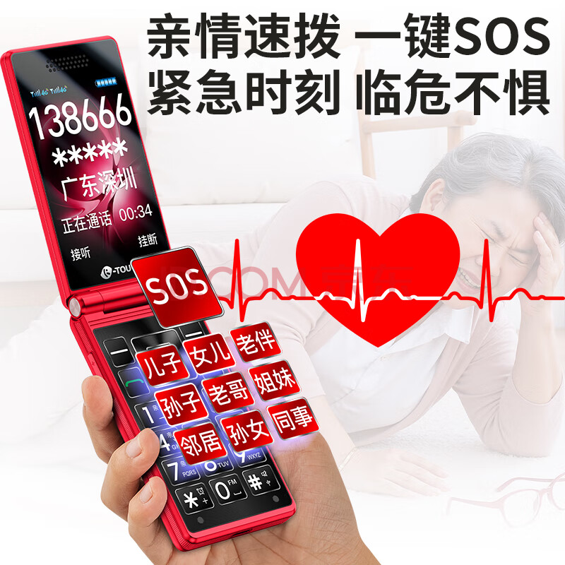 商品相册:天语V9S+ 全网通4G翻盖老人手机超长待机大声音量大按键大字体大屏商务备用老年人学生专用手机 红色第