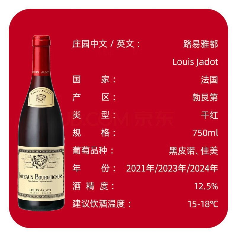 商品相册:路易亚都世家(Louis Jadot)勃艮第山丘黑皮诺佳美干红葡萄酒 2021/2023/2024年 750ml第