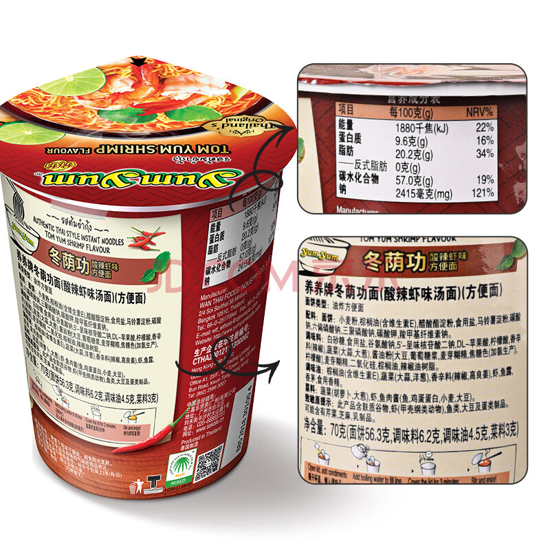 商品相册:养养YumYum泰式冬阴功酸辣虾味汤面 70g*2杯 泡面速食方便面第