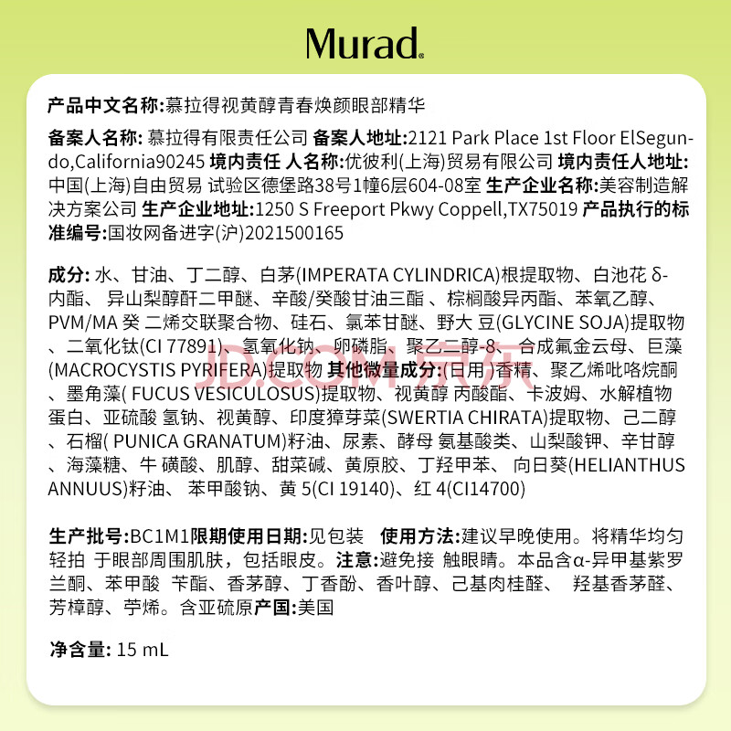 商品相册:Murad慕拉得视黄醇A醇眼部精华15ml护肤品抗老女神节礼物 送女生第
