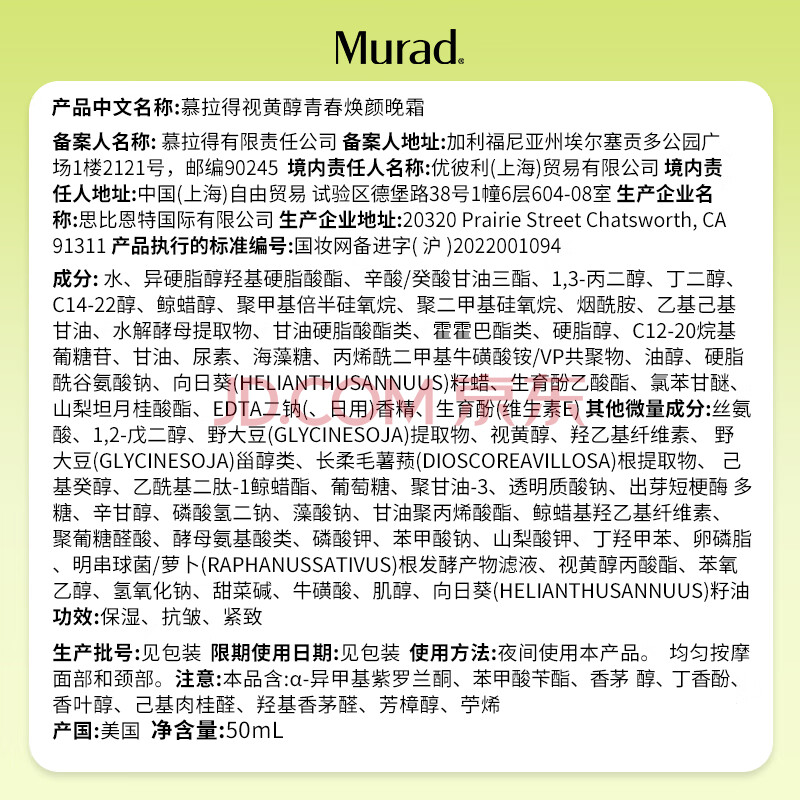 商品相册:Murad慕拉得视黄醇A醇晚霜50ml抗皱抗老淡纹【王一钧高维蔓同款】第
