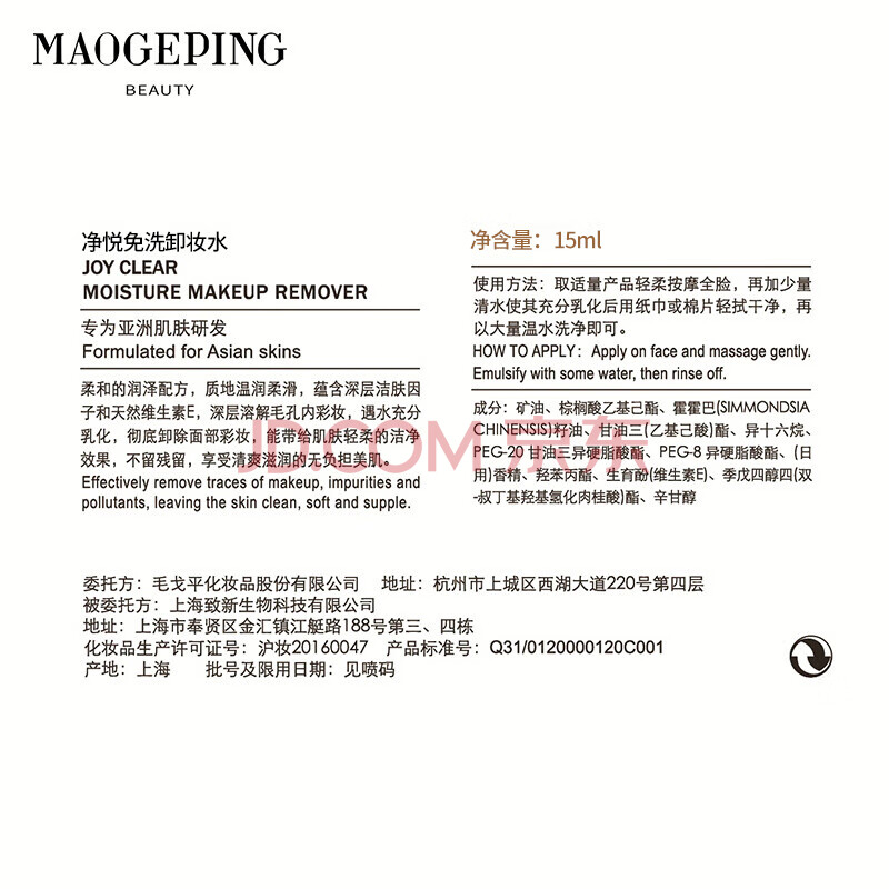 商品相册:毛戈平净悦免洗卸妆水脸部清洁卸妆15ml生日礼物送女友第1张/共3
