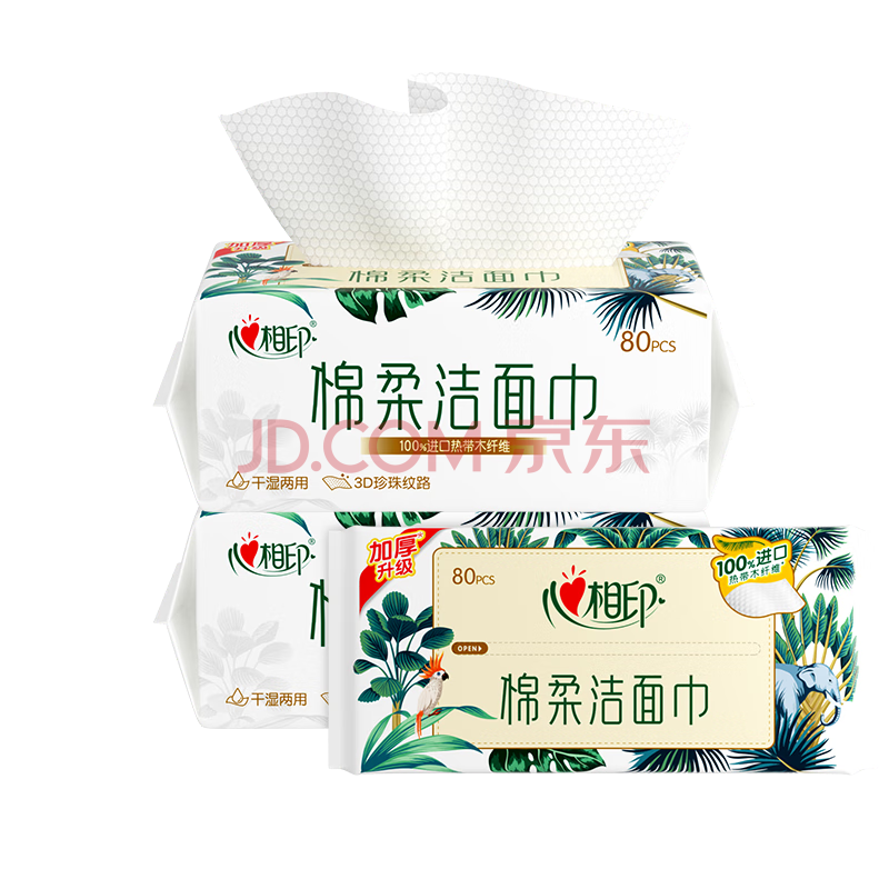 商品相册:心相印洗脸巾80抽*3包干湿两用棉柔洁面巾加厚一次性毛巾抽式 擦脸巾第