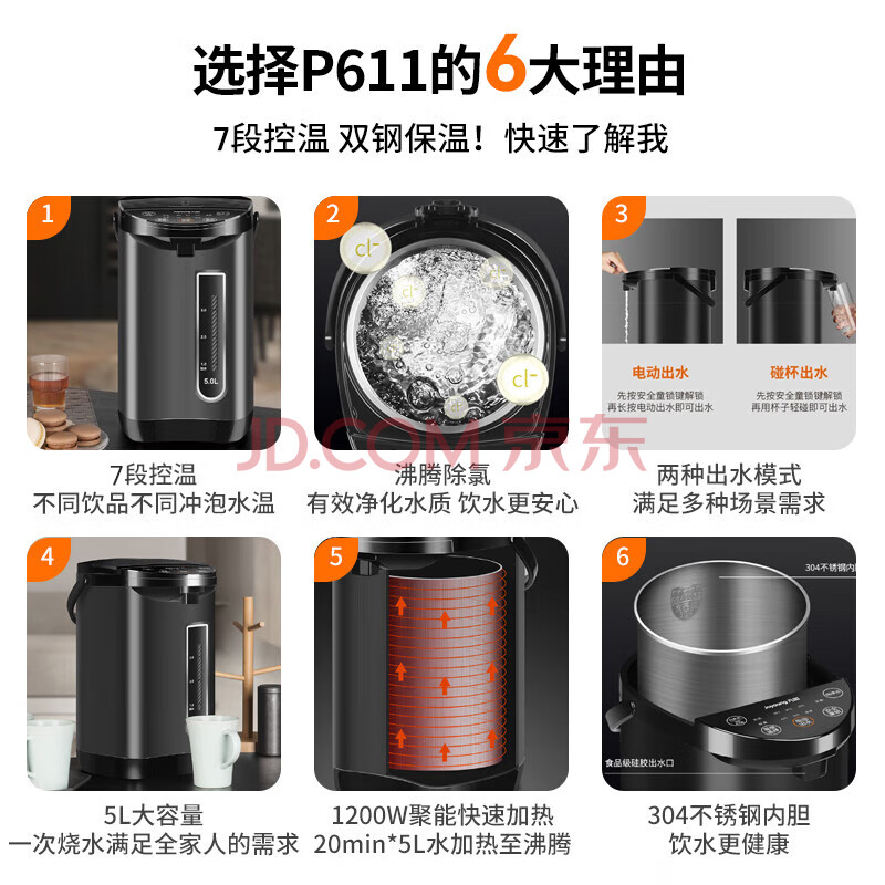 商品相册:九阳(Joyoung)电热水瓶热水壶 5L 七段保温304不锈钢内胆 0胶水恒温电水壶烧水壶 K50-P611第