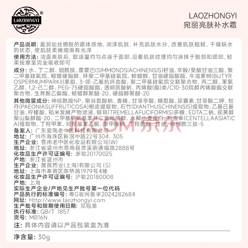 商品相册:老中医宛丽亮肤补水霜30g 改善肌肤干燥暗沉不均淡化色斑提亮肤色第