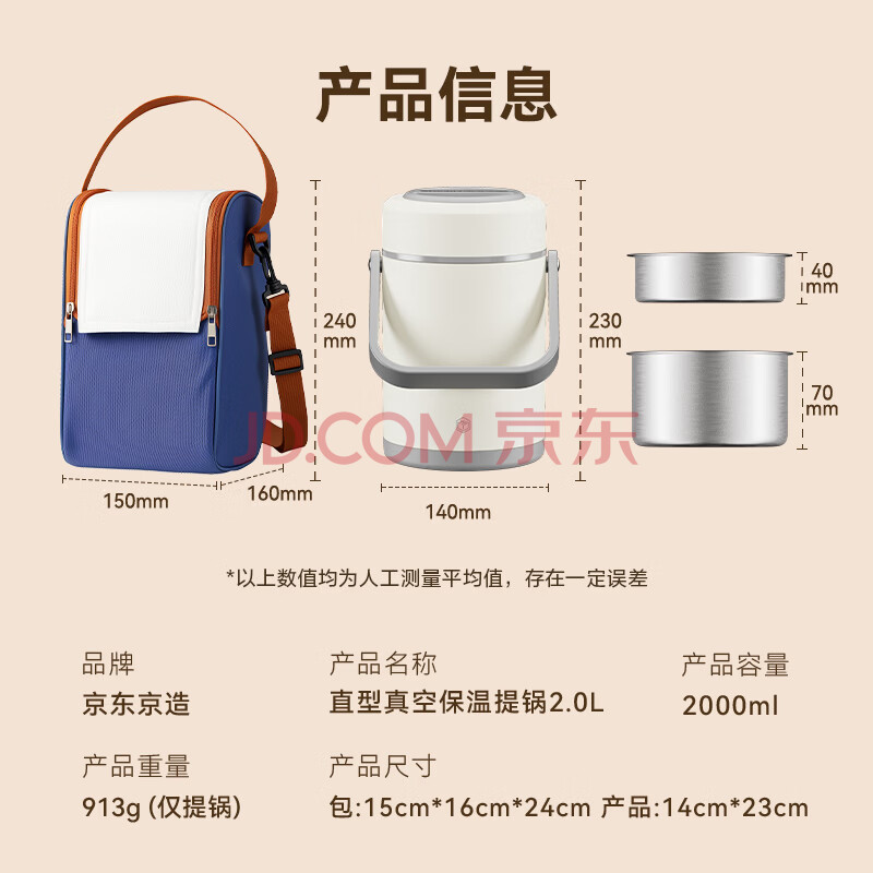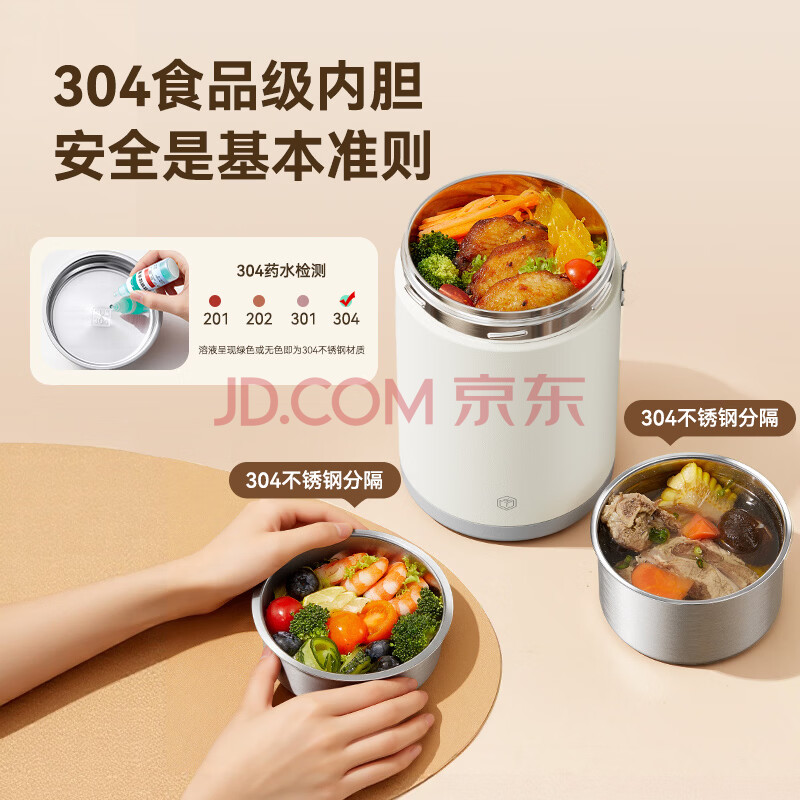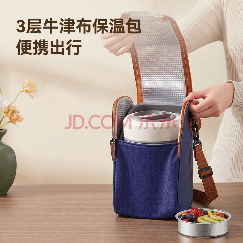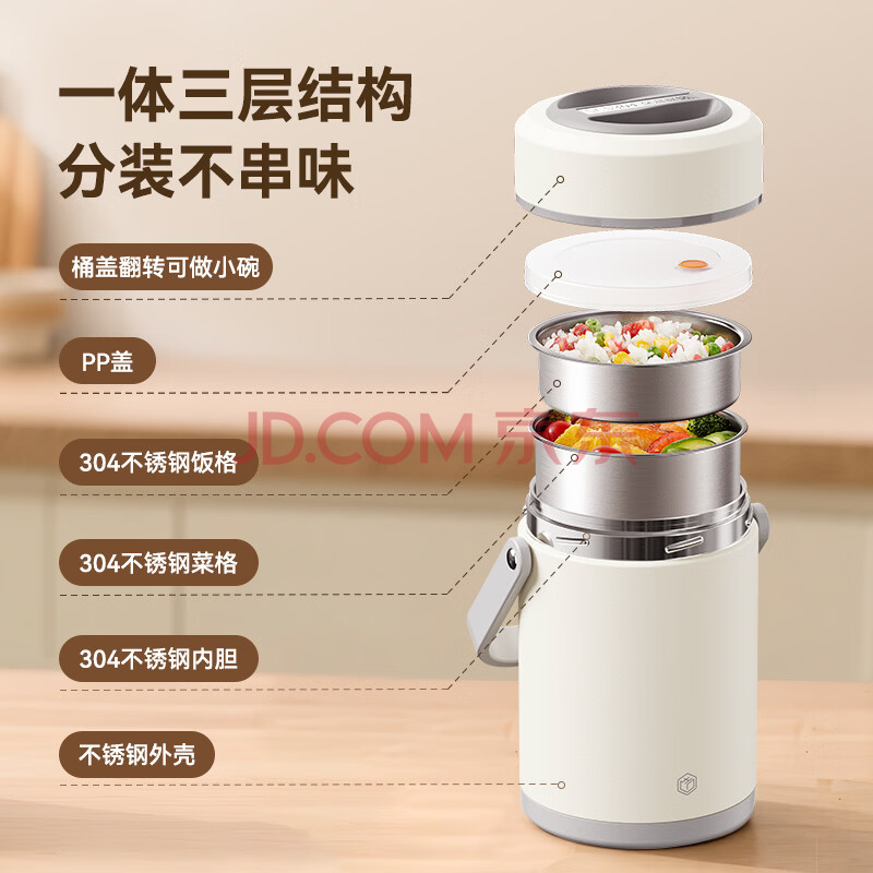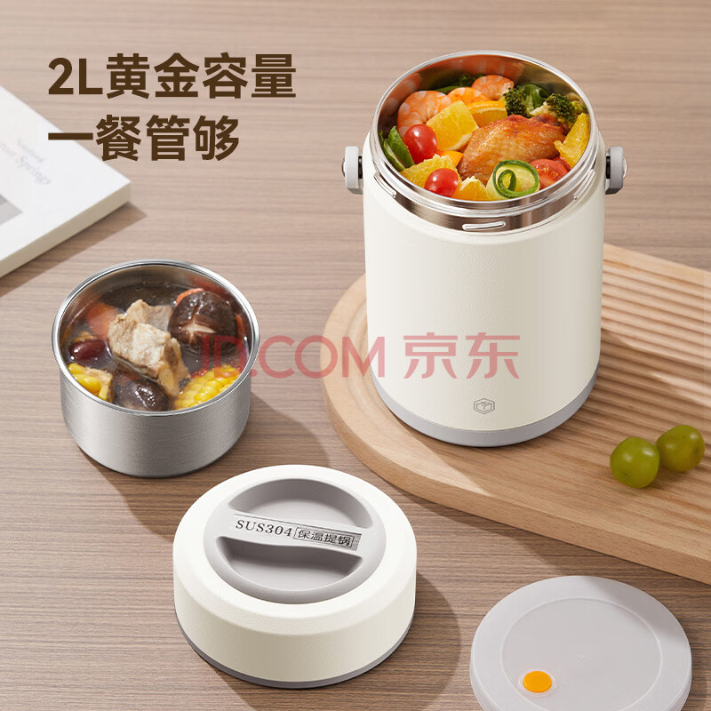 商品相册:京东京造 保温饭盒 保温桶上班族304不锈钢小学生带盖餐盒三层2L 配保温袋第