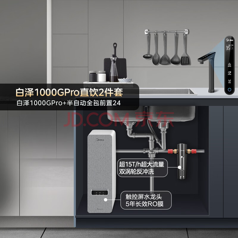 商品相册:美的(Midea)省芯直饮净水器套装【白泽1000Gpro+前置过滤器-24pro】厨下式智能水龙头 RO反渗透家用一体净饮机第
