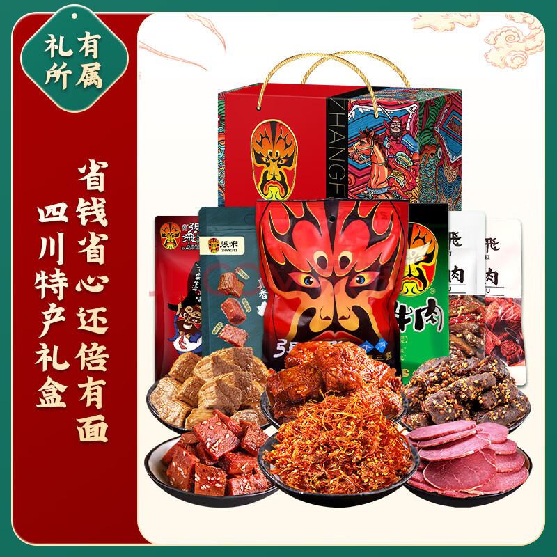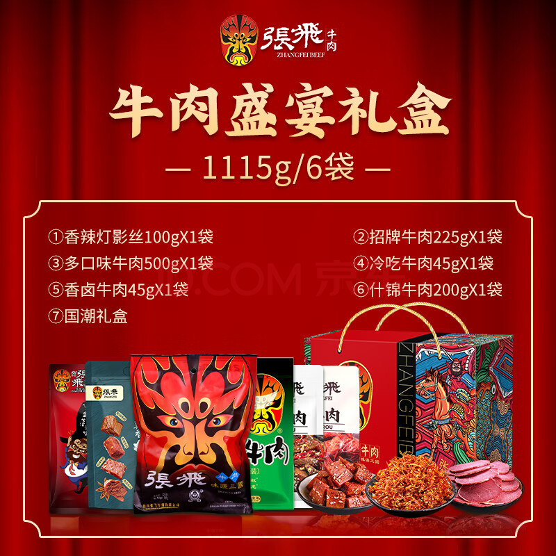 商品相册:张飞 牛肉零食卤味礼盒1115g(超2斤)牛肉年货休闲零食礼盒 国潮礼盒第
