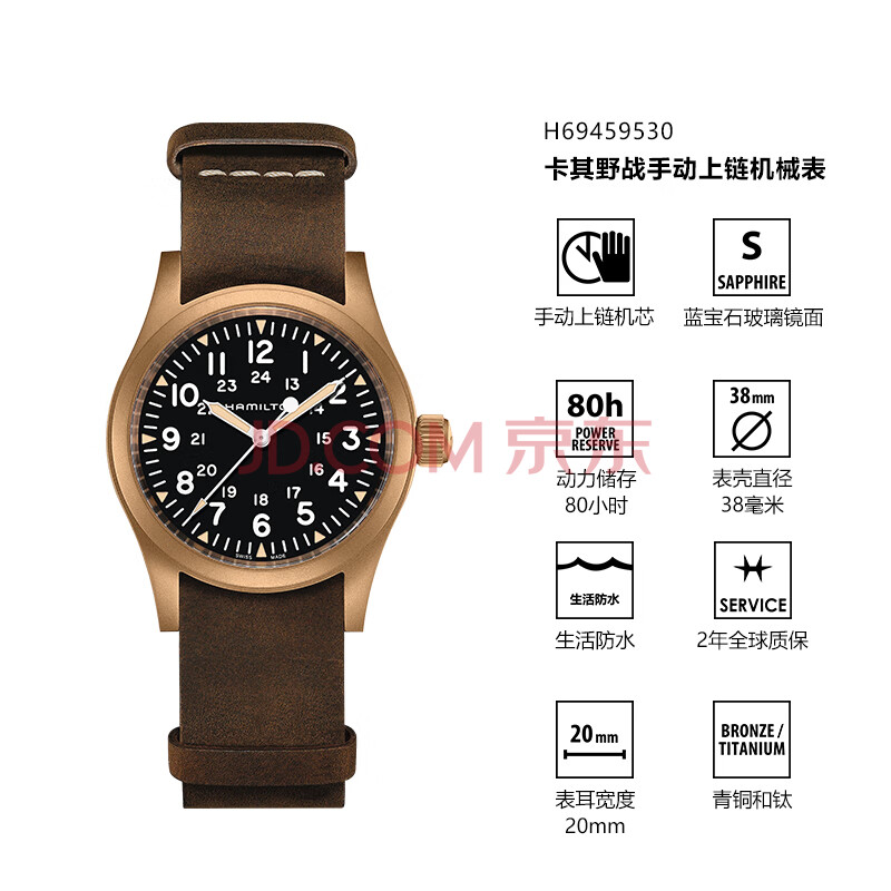 商品相册:汉米尔顿(Hamilton)汉密尔顿卡其野战手动上链机械表38黑盘青铜表壳军表瑞士手表礼物第
