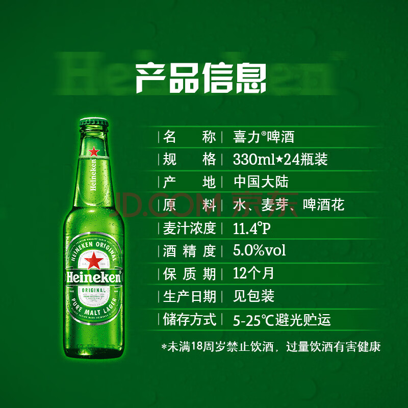 商品相册:喜力经典330ml*24瓶整箱装 喜力啤酒Heineken 京东自营 婚宴用酒第
