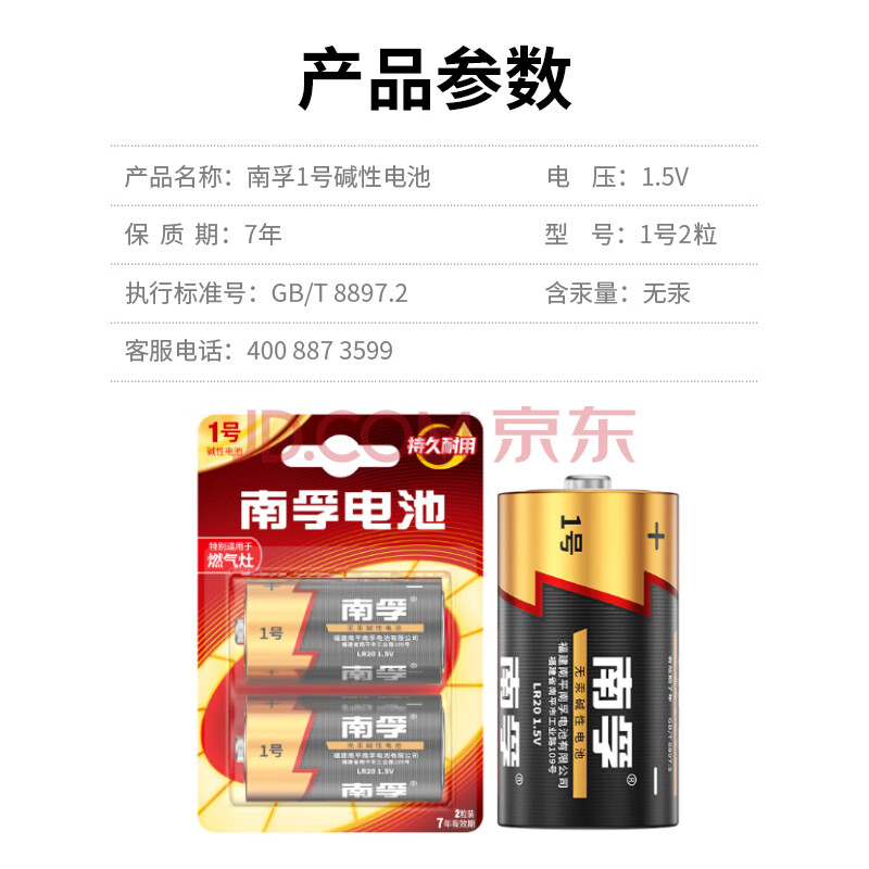 商品相册:南孚1号碱性电池2粒 大号D型电池 适用于热水器/煤气燃气灶/手电筒/电子琴/挂钟等 LR20-2B第1张/共4