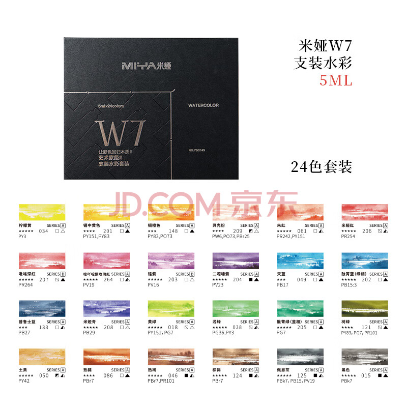 商品相册:【全网低价】米娅(MIYA) W7支装水彩颜料专业艺考5ml24色套装高品质用料色彩浓郁膏体细腻美术生艺考生专用美术写生第
