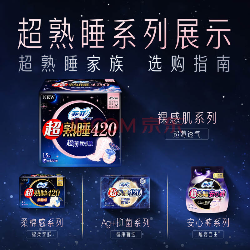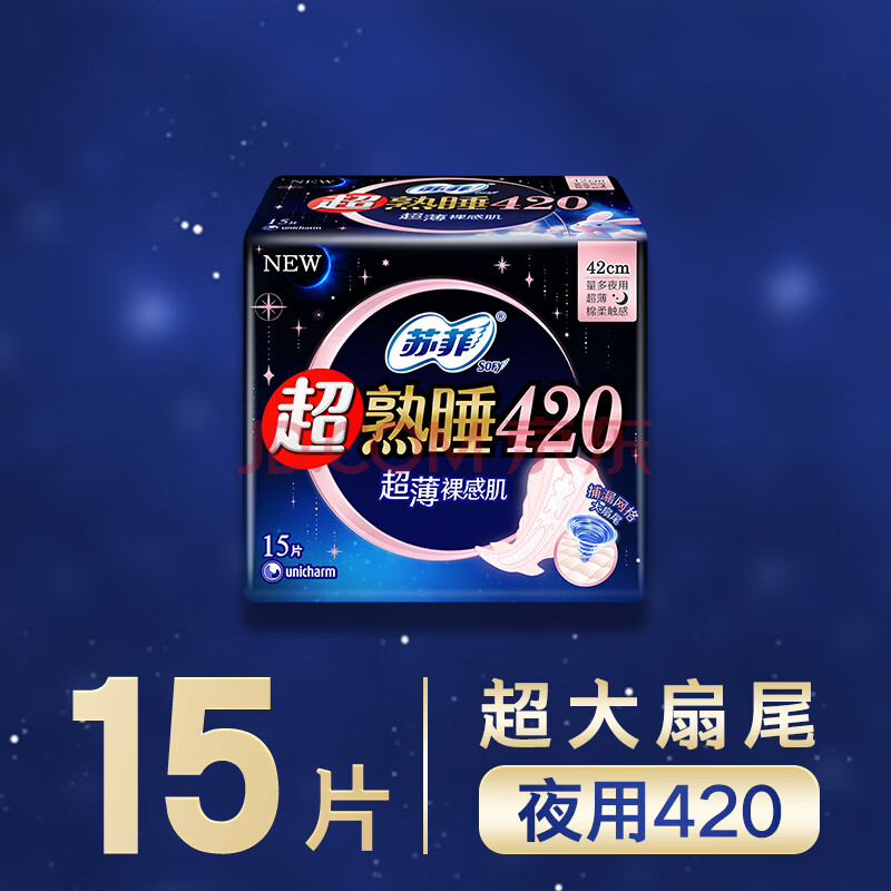 商品相册:苏菲超熟睡裸感肌超长夜用卫生巾42cm15片超大扇尾姨妈巾自营第