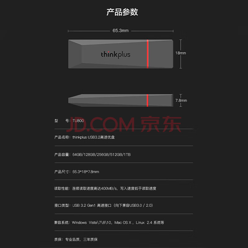 商品相册:ThinkPlus联想(thinkplus)1TB USB3.2高速传输U盘 大容量移动闪存优盘金属便携U盘 车载电脑办公多用TU800第