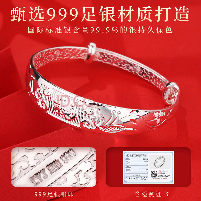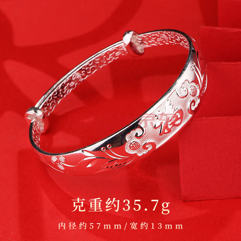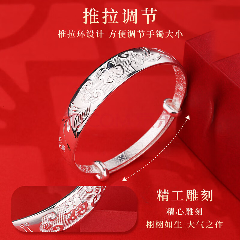 商品相册:老银匠999足银手镯送妈妈礼物宽面花蔓福字银镯子民族风推拉款银手镯女第