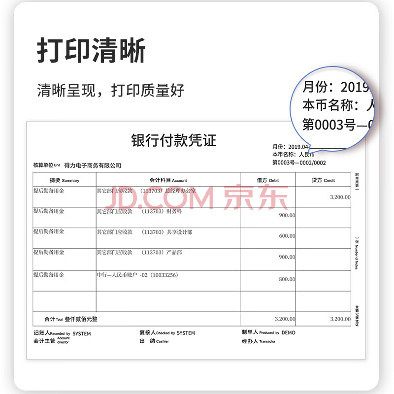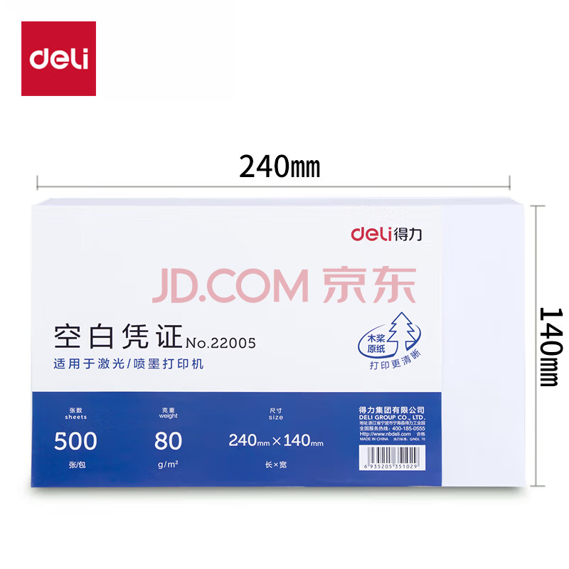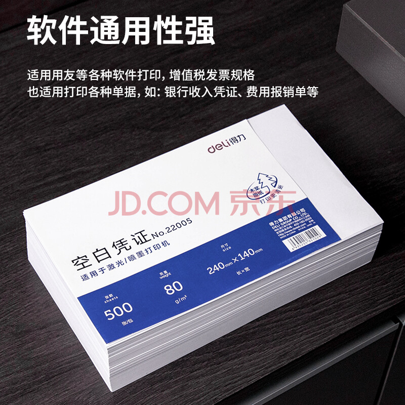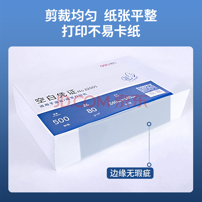 商品相册:得力(deli)优选80g晨鸣云镜空白单据凭证纸 适用于用友金蝶财务软件记账凭证打印纸 240*140mm 500张 22005第
