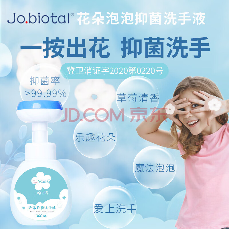 商品相册:JOBIOTAL花朵泡泡抑菌洗手液 健康抑菌草莓味泡沫花瓣形洗手液300ml第