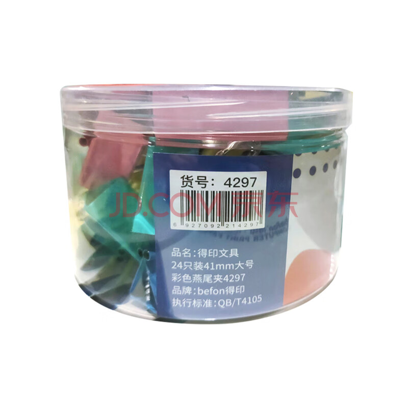 商品相册:得印长尾夹24只41mm大号2#燕尾夹彩色纸票夹金属铁夹子票据单据小夹子文具办公用品24只/筒 4297第