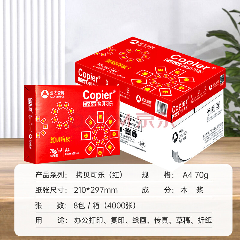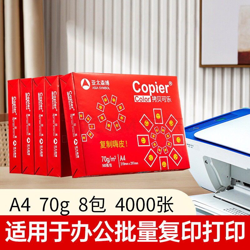 商品相册:亚太森博红拷贝可乐A4纸 70g 500张*8包 办公用纸 双面多功能复印纸 4000张整箱【专业造纸厂牌】第