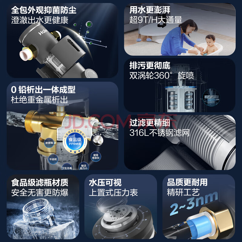 商品相册:海尔(Haier)前置过滤器超9T大通量家用净水器40微米反冲洗精滤实时水压监测全屋净水一键自动冲洗HP-37第