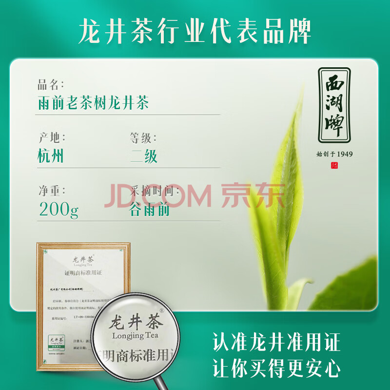 商品相册:西湖牌绿茶龙井茶叶 雨前珍稀老茶树200g春茶自己喝送礼第