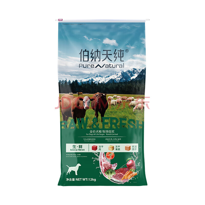 商品相册:伯纳天纯生鲜1.0全价通用冻干犬粮牧场狂欢(牛肉+羊肉+兔肉)12kg/24斤第