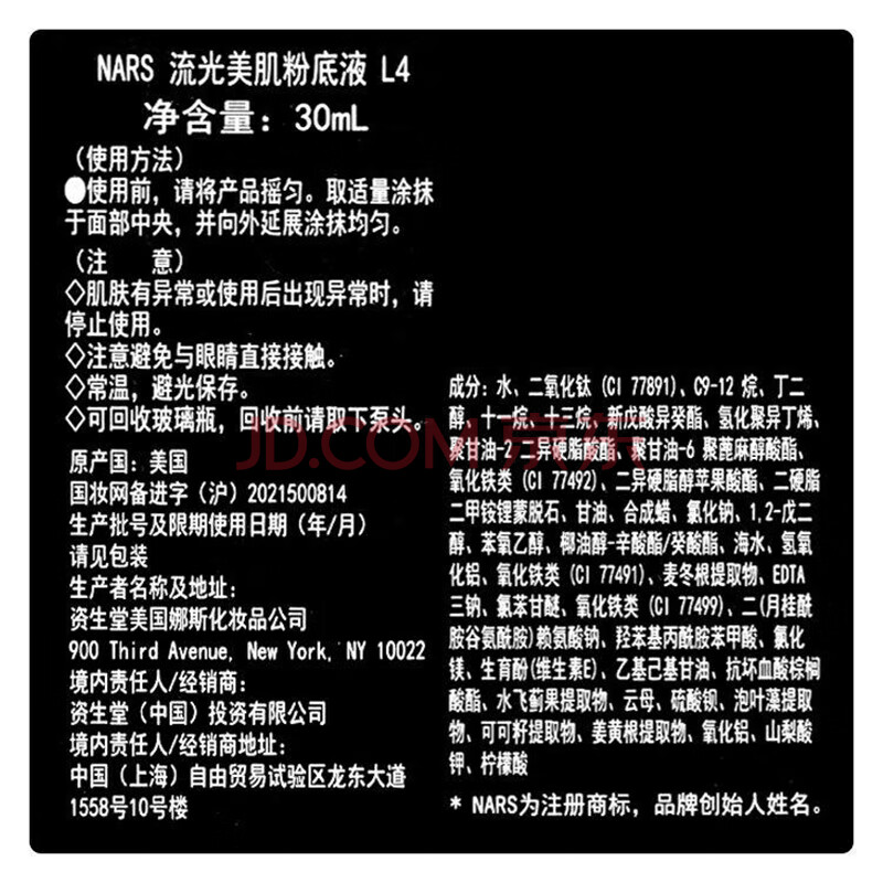 商品相册:NARS超方瓶流光美肌粉底液L4 DEAUVLLE黄1.5白第