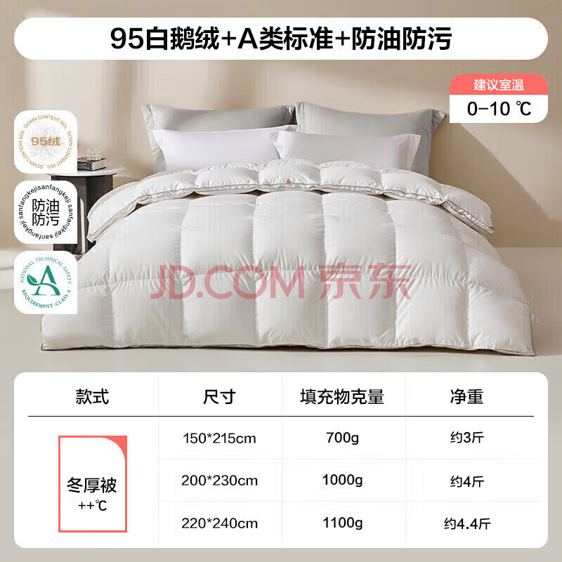 商品相册:LOVO罗莱A类 95%昆仑白鹅绒羽绒被 冬被 1000g填充200*230cm 白色第