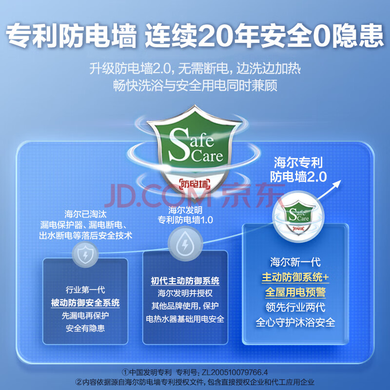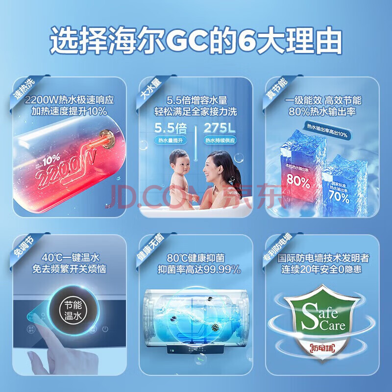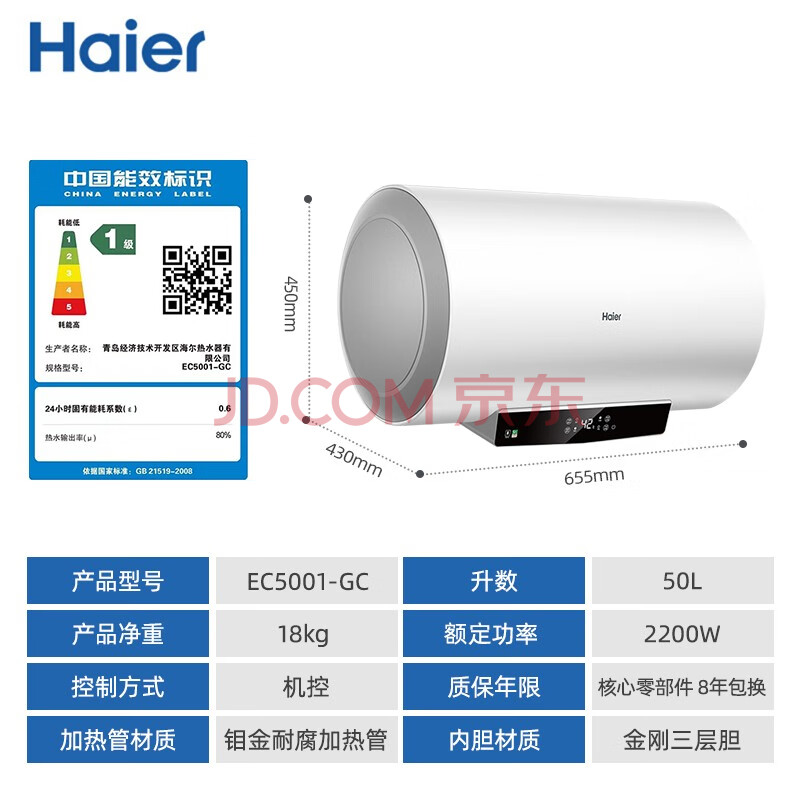 商品相册:海尔(Haier)安心浴50升储水式热水器电家用洗澡 2200W速热大功率 5.5倍大水量 一级能效 EC5001-GC第