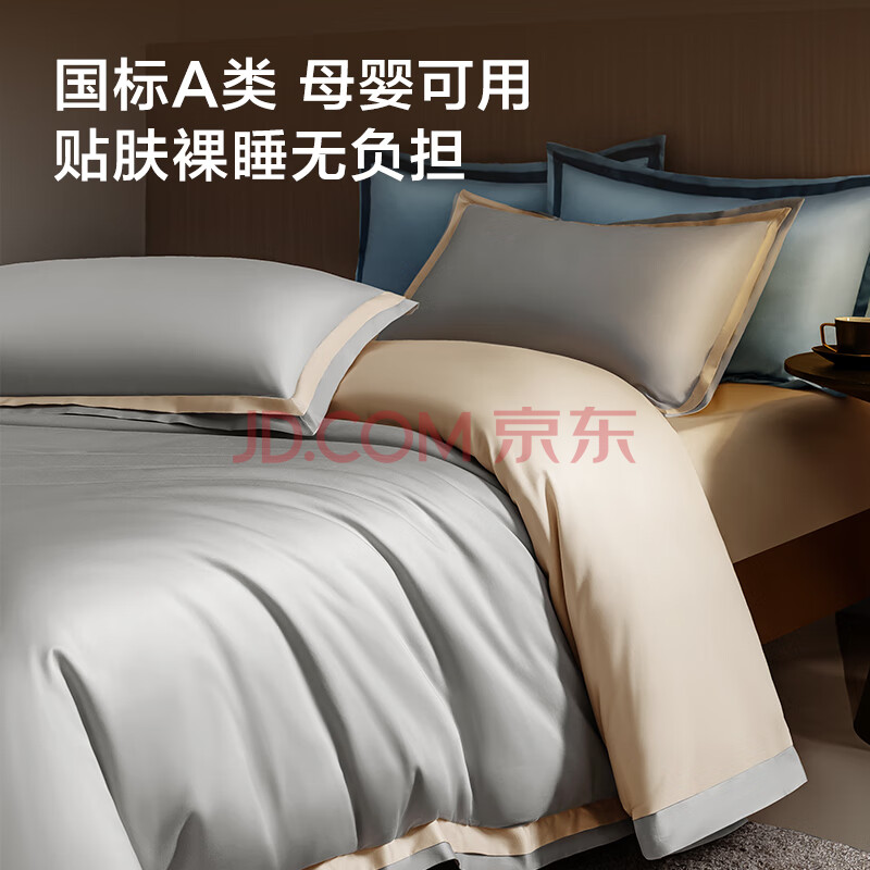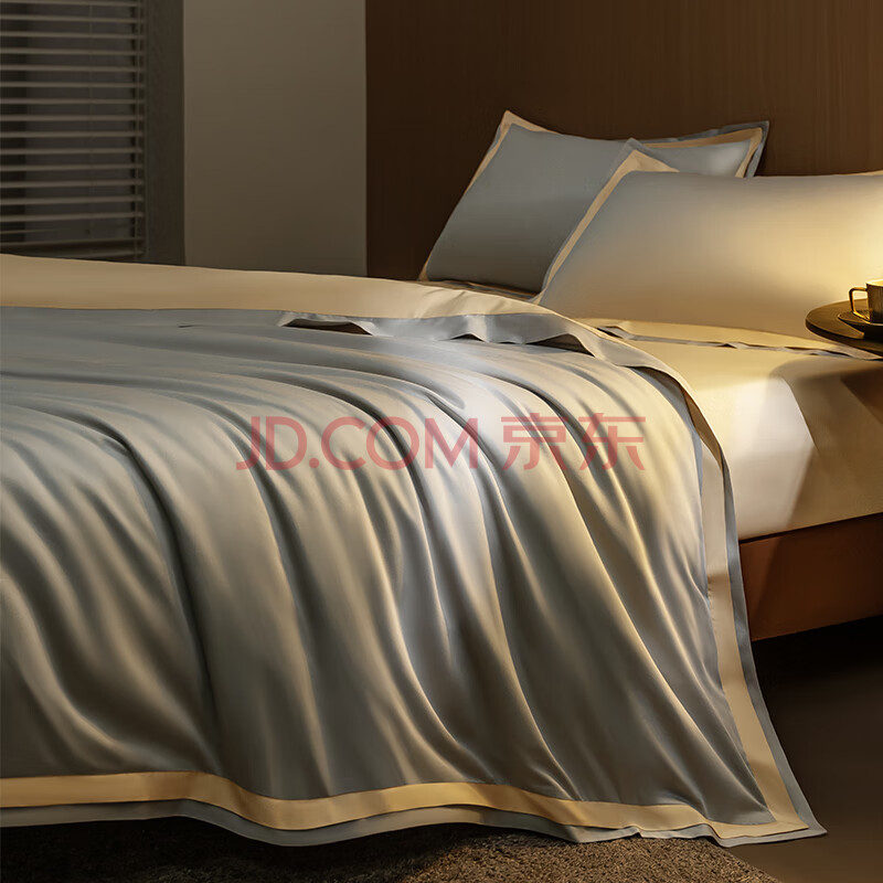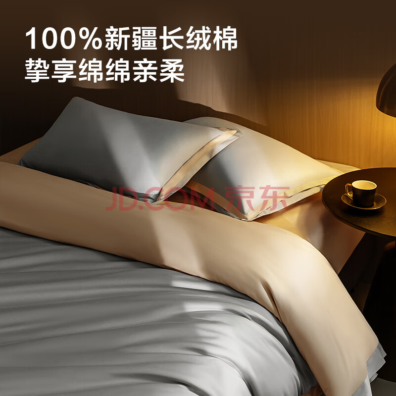 商品相册:京东京造100支长绒棉床上四件套 植素超柔贡缎轻奢床单被套床品套件抗菌 1.5米床银灰香槟第