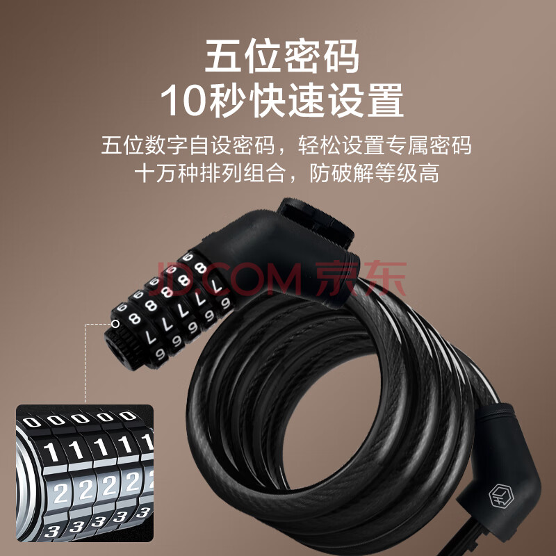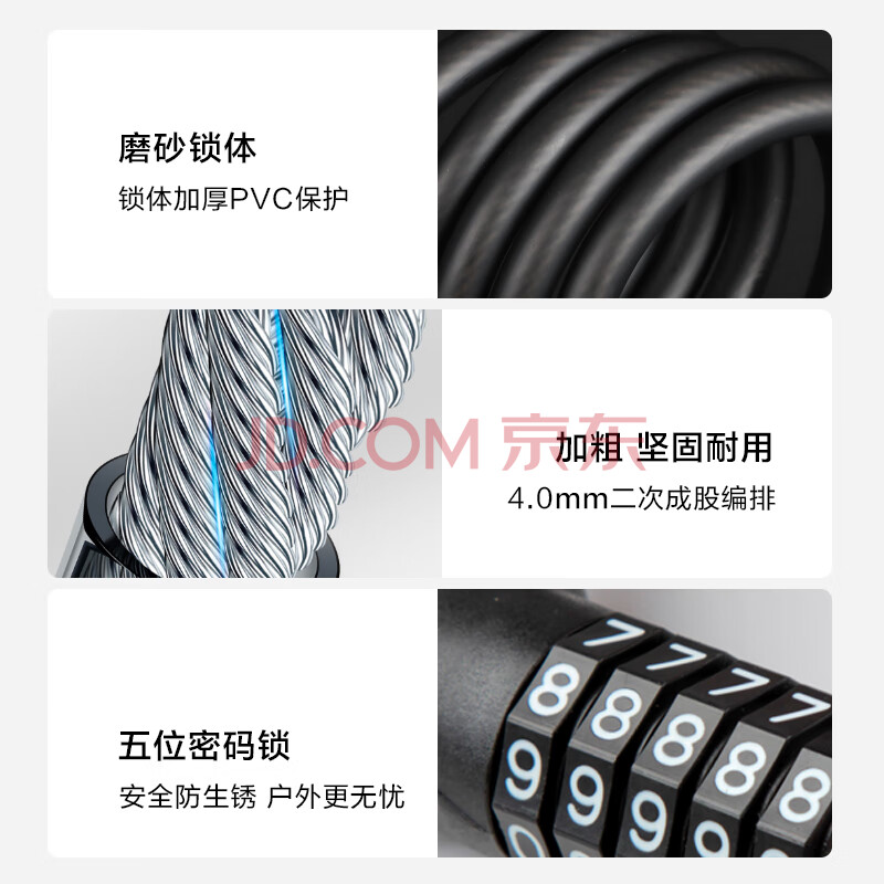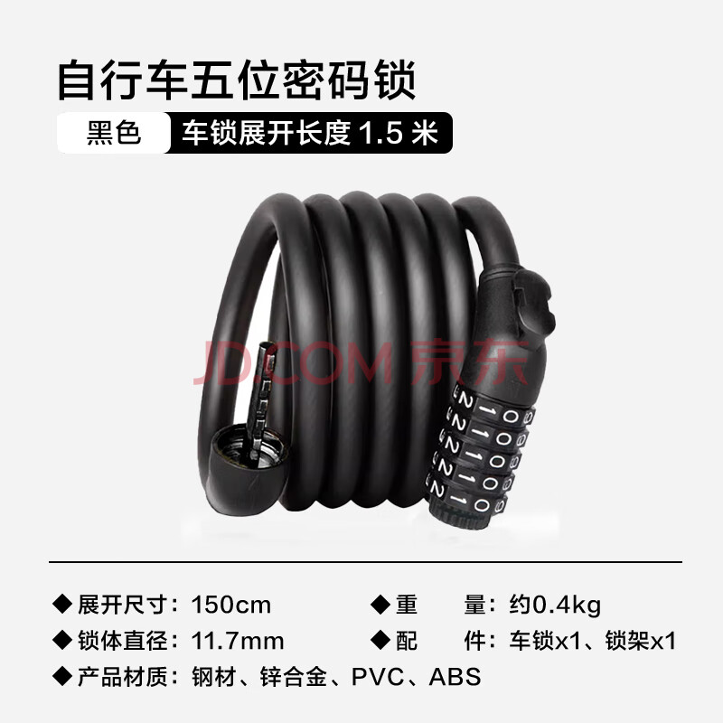 商品相册:京东京造【150cm加长防盗】自行车锁五位密码锁 电动电瓶车公路山地单车锁第