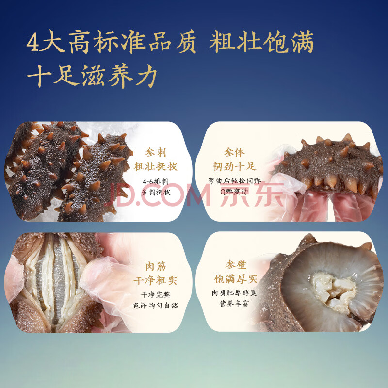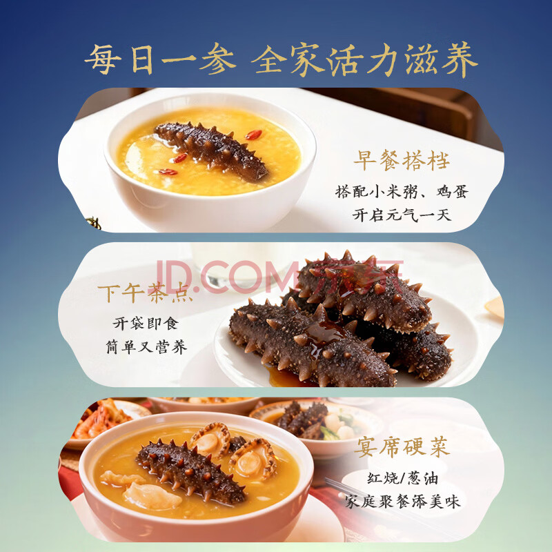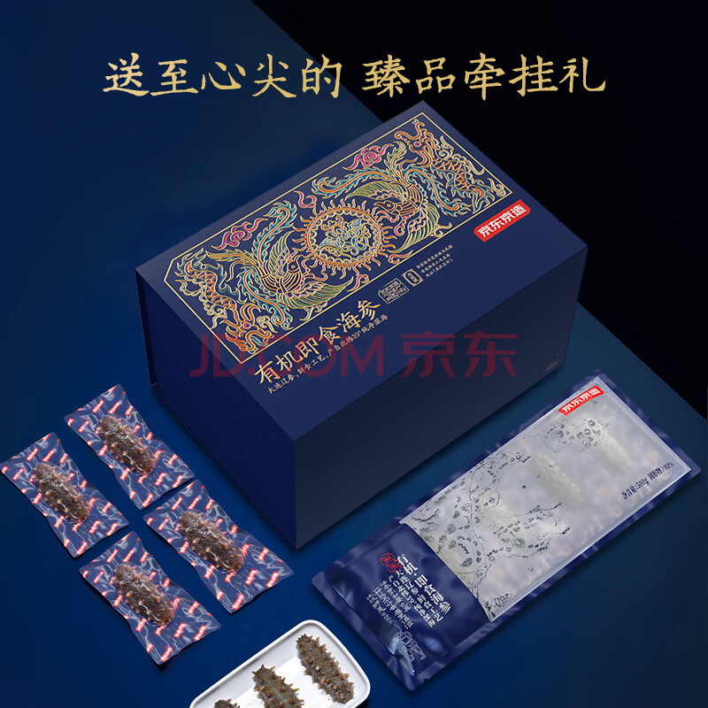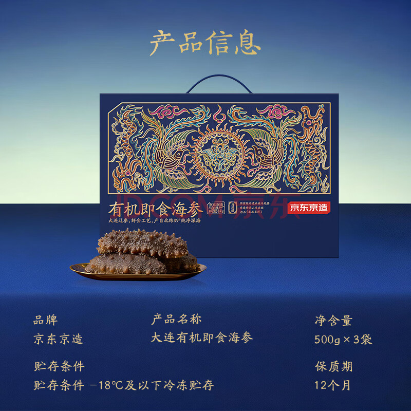商品相册:京东京造鲜来多大连有机鲜食海参500g*3 共24-30只冷冻即食海参 礼盒第