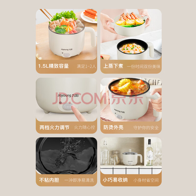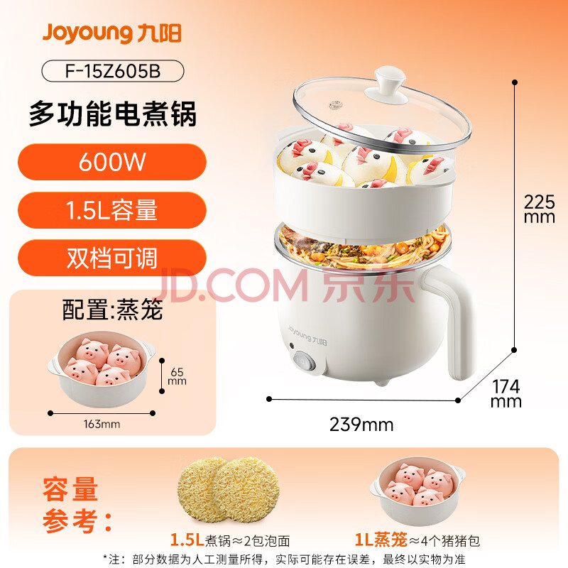 商品相册:九阳(Joyoung)电煮锅小电锅宿舍小锅电蒸锅 学生寝室一体泡面小火锅多功能锅一人电火锅F-15Z605B第1张/共7